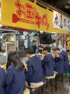 昼食はお好み焼き!向かい合う2軒のお店に分かれて広島風のキャベツたっぷりのお好み焼きです。
