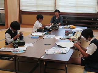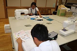 マルチルームと和室、隣り合わせで、5年生はエプロン作り、6年生はナップザック作りをしています。