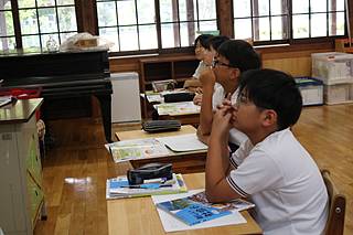 日誌を書き、夕焼け村の村長さんに見ていただいた後、大切な人に宛てて、絵はがきを書きます。もちろん、宿題もがんばっています。ジュニアリーダーに教えてもらうこともでき、それぞれのペースで学習を進めることができていました。