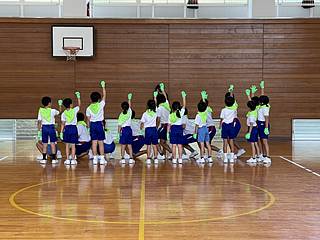 日差しを避けて、体育館で練習を行い、何度も給水タイムをとりましたが、アップテンポのダンスでみんな汗一杯でした。まだまだ、悩みながらの演技ですが、これからどんどん上達することと思います。